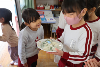 年少さんが育てたカブを園務員さんに調理してもらいいただきました。