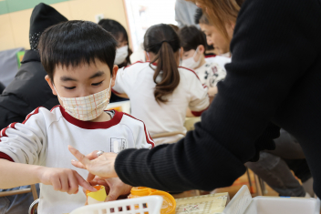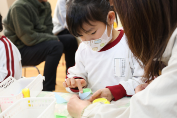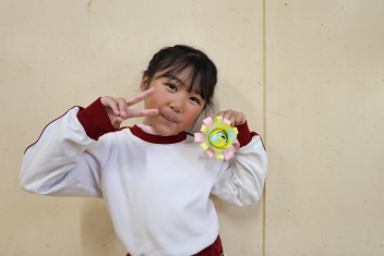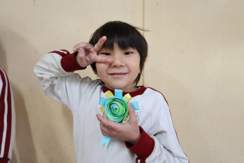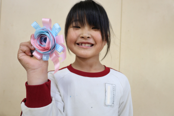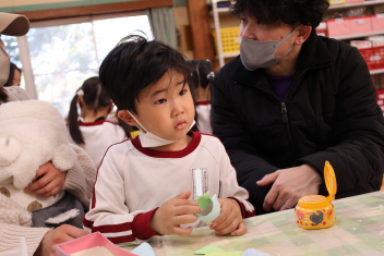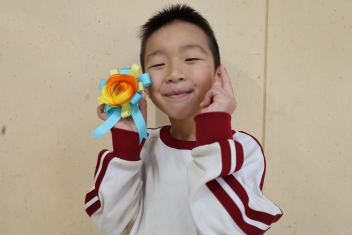 第Ⅱ部は、コサージュづくり。卒園式の時に胸元に付けるコサージュをおうちの人に手伝ってもらいながら、自分だけの世界で一番素敵なコサージュが完成しました。コサージュを付ける日が来ることが、「楽しみ」と「寂しさ」が入り混じる気持ちです。