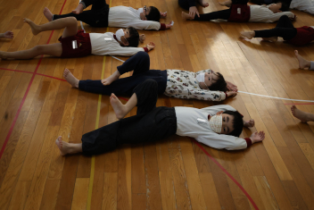 これは、今回初めて取り入れた動きです。「ティーチディール」と言います。沖縄の数え歌に合わせて正中線を超える動きです。右肘と左膝を合わせるように動かすのですが、なかなか難しく、右肘と右膝を合わせる動きになってしまっていました。