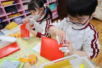 次に、赤色の台座に模様を付けるために、正方形の三色の折り紙を貼っいきました。今日はここまででした。