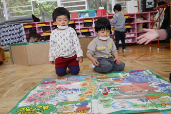 年少さんが、〇の方に移動すると、みんなで「こっち!」「こっち!」と正しい方に来るように手招きしたり声を掛けたりしている様子がとても微笑ましかったです。✖が正解と分かると大喜びでした。