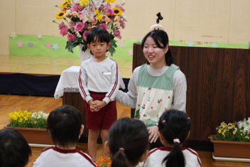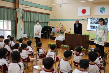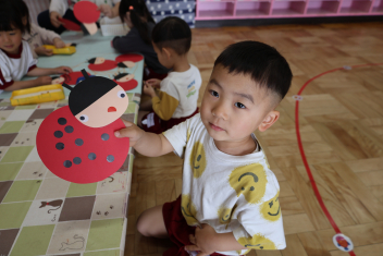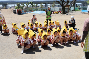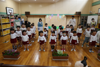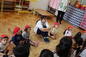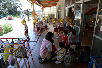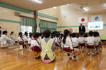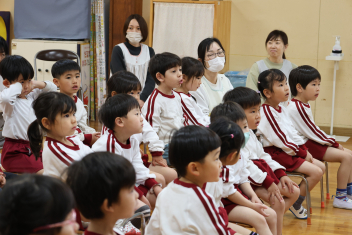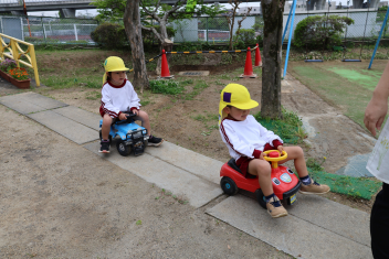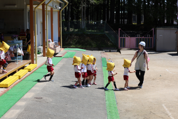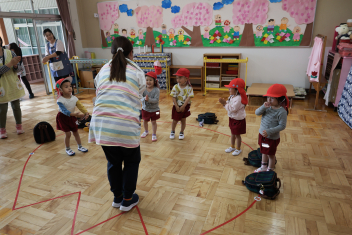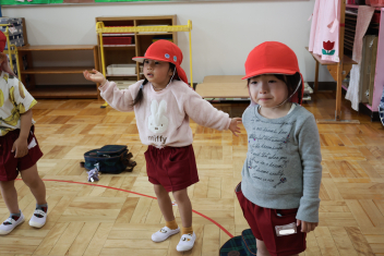 今日は第1回の地震による避難訓練でした。まずは基本的な地震が起きた時の避難の仕方(身を守る方法…ダンゴムシ・防災頭巾、避難経路、おはしも)を確かめました。年少さんは、年長さんがどのように避難するか見ていました。