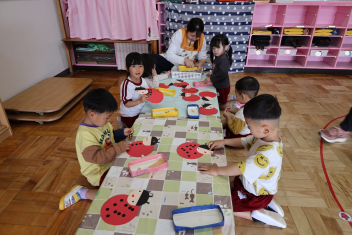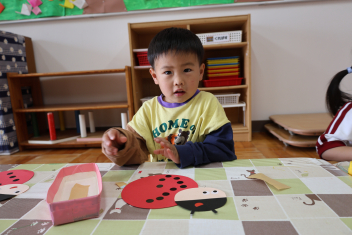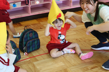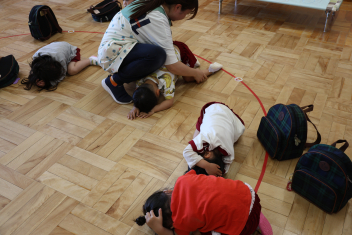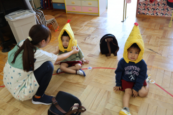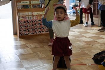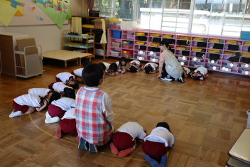 年少さんは、避難訓練を終え、保育室でダンゴムシの姿勢や防災頭巾のかぶり方を練習しました。