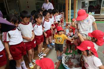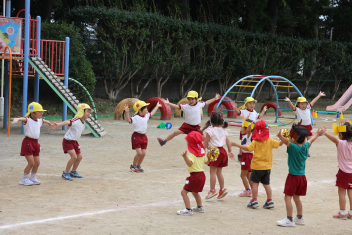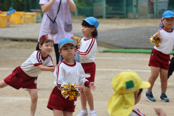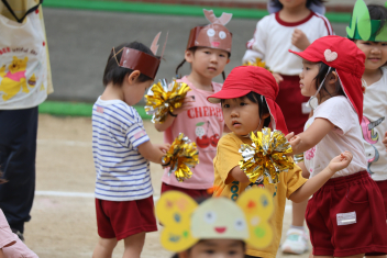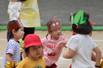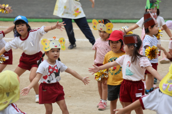 今日の赤佐っ子タイムは、年中さんが運動会で披露したむしむしフェスティバルダンスでした。年長さんや年少さんは、年中さんの虫のお面や手首にまいたポンポンを借りて踊りました。