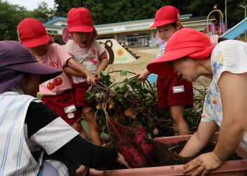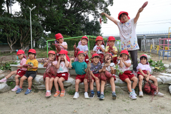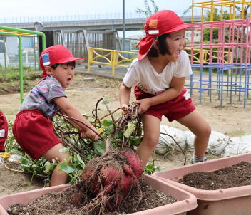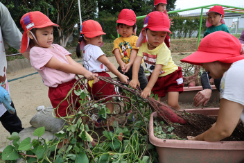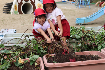 年少さんが園内畑の芋掘りをしました。先日試し掘りをして大きかったので、どうかなと思っていましたが、期待以上の大きさでした。年少さんの顔と同じくらいのお芋が採れました。掘り上げた時は、子供たちからは歓声やら驚きやら!