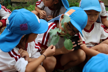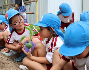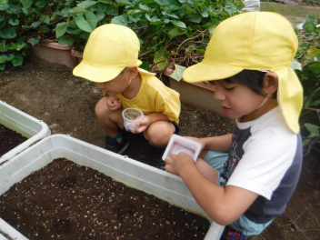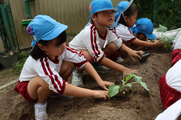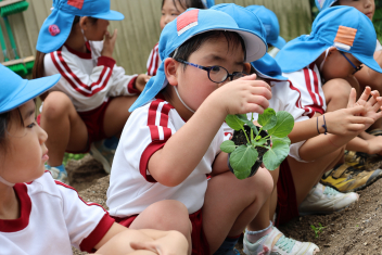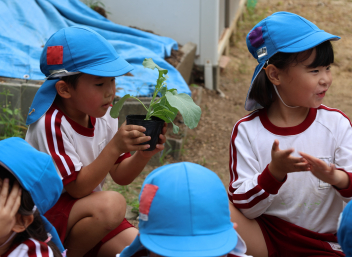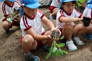 年長さんが、3種類の野菜の苗(ブロコッコリ、ミニキャベツ、ロマネスコ)を植えました。苗を手にして、葉っぱの色や形や葉触り。においを観察しました。3種類の違いも確かめました。