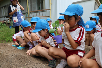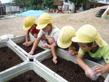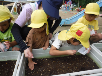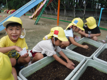 年中さんも10月1日に大根の種をまきました。今日収穫したサツマイモのように持ち上げられないくらい大きく育つといいですね。