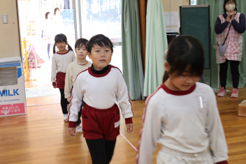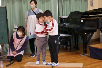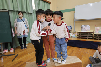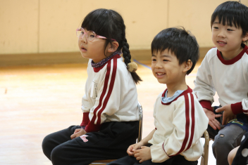 • 今日は、年長さんだけの参加会でした。第Ⅰ部はチャレンジ大会。年長さんがこれまでに遊びの中で挑戦してできるるようになったことを披露しました。お父さんやお母さんが見守る中、緊張しながらも練習を重ねてきた技や動きにチャレンジました。みんな、自分の目標達成に向けて一生懸命に頑張りました。真剣な表情はとても輝いていました。