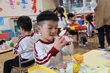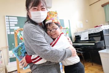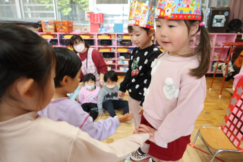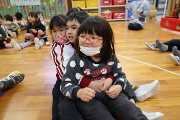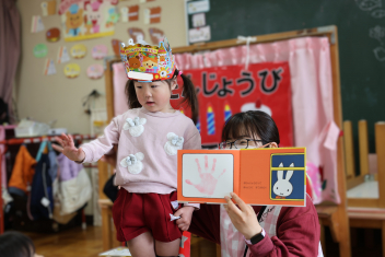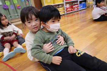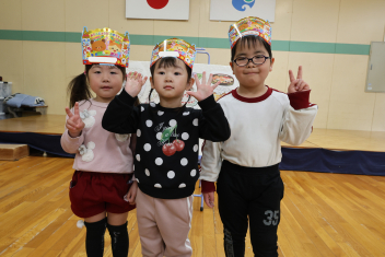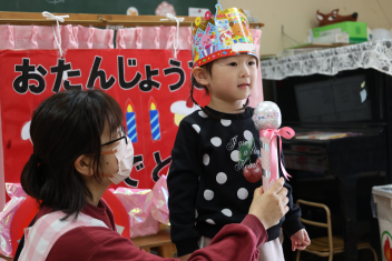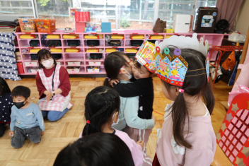 • 今日は、2月生まれの子の誕生会でした。年少さん2人、年長さん1人でした。それぞれのお部屋で、おうちの人にも来てもらってお友達とお祝いをしました。誕生月の子は、冠をかぶって、ニコニコ顔でとってもうれしそうでした。好きなことや食べ物を聞かれて、少し照れている感じも見られました。最後は、ママにハグしてもらい満面の笑みでした。