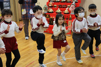 • 今日は桃の節句、赤佐幼稚園では遊戯室に全員のひな人形を飾ってひなまつり会を開きました。
