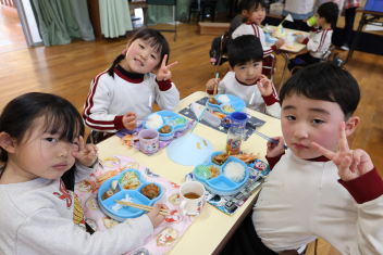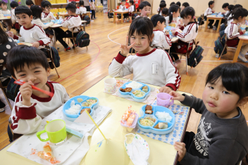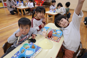 会が終わってから遊戯室でなかよしグループごとにお昼ごはんを食べました。特別に菓子を用意したら、「やったー!」と大喜びでした。