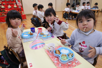 保育室に戻ったらお楽しみがありました。ひなあられと甘酒に見立てたカルピスです。ひなあられはハートの形をしていたので、とても気に入ったようです。