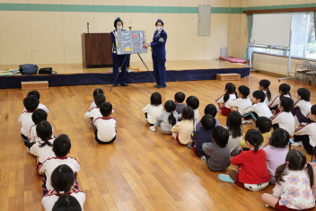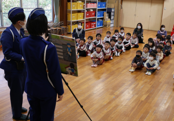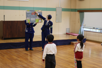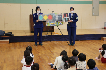 はじめに、遊戯室に全園児が集まり、①右側通行が大事なことと②信号機の見分け方について、改めて学びました。