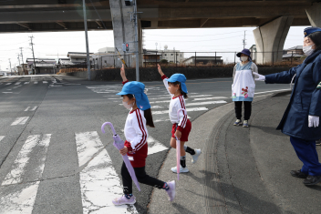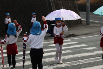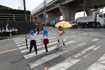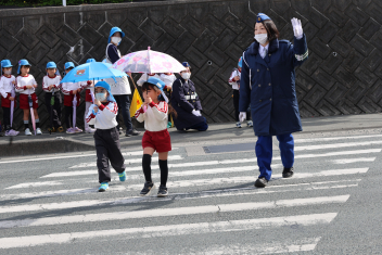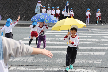 このあと、年長さんは、登下校の練習として、傘さし訓練を高架下の信号機がある場所で行いました。東から西に渡る訓練でしたので、信号機が青色(進め)の点灯時間が短く、素早い判断が求められました。全員、何とか信号を守って横断することができました。
