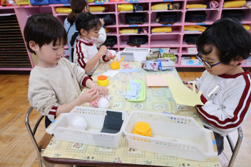 年長さんが雛人形づくりに取り掛かりました。水風船を土台に新聞紙や半紙を貼っていました。完成したら遊戯室に飾る予定です。