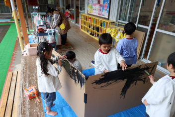 お化け屋敷を作るそうです。真っ黒に塗ってお化けの雰囲気を出しているようです。