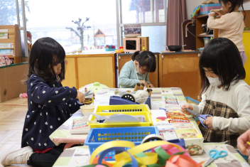 お別れ会も明後日に迫ってきました。年中組さんは、毎日練習したり、準備したりして頑張っています。今日は遊戯室の飾りものを作りました。