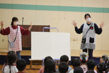 お楽しみは、先生方によるパネルシアターでした。「魔法の電子レンジ」を語りに合わせて、パネルを張り、読み進めていきました。ラーメン容器を電子レンジに入れ、魔法の歌が歌い終わるころには、何もなかった容器にラーメンが入っていてびっくり!子供たちは、目を回るくして、体を乗り出し、「なんで?」という表情をしていました。