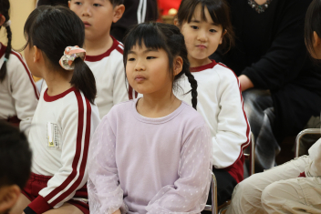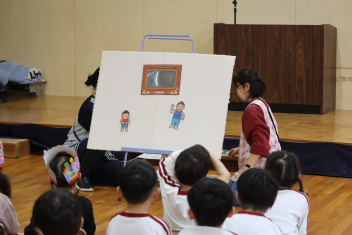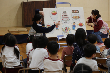 お楽しみは、「こどものとも社」の田力さんを講師にお招きし、たくさんの絵本を読み聞かせてもらいました。「かおたいそう」の絵本では、子供たちも自分の顔を絵本の顔に似せて楽しんだり、他の絵本では真剣に聞いたりと、子供たちから様々な表情が見られました。「絵本ってすごいな!」と思いました。