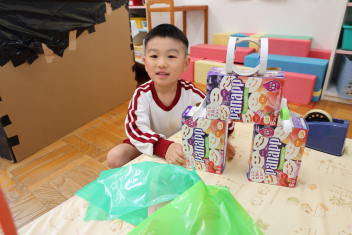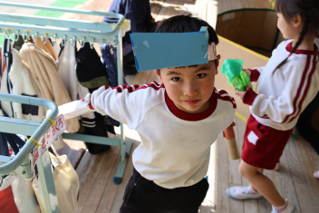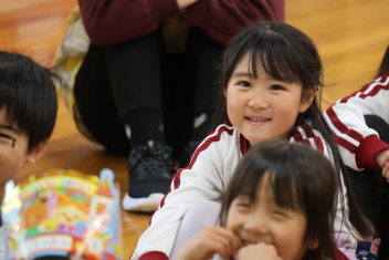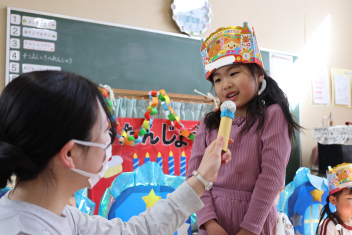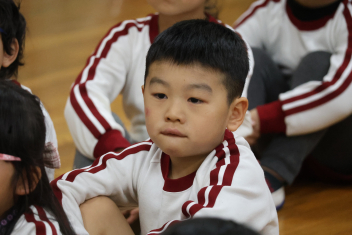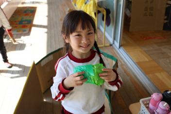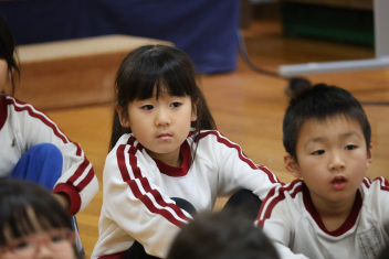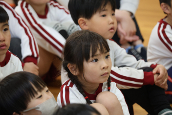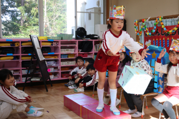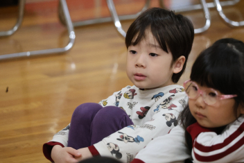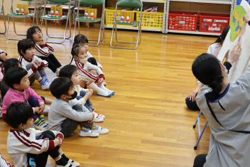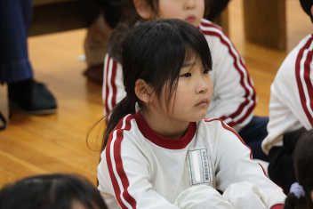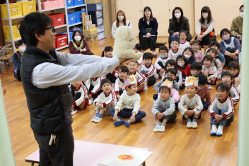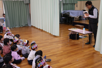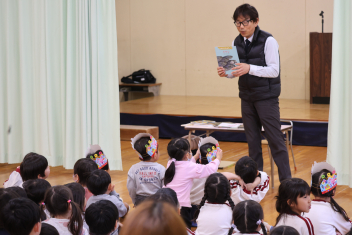 お楽しみは、「こどものとも社」の田力さんを講師にお招きし、たくさんの絵本を読み聞かせてもらいました。「かおたいそう」の絵本では、子供たちも自分の顔を絵本の顔に似せて楽しんだり、他の絵本では真剣に聞いたりと、子供たちから様々な表情が見られました。「絵本ってすごいな!」と思いました。