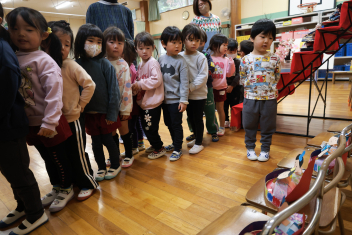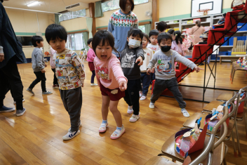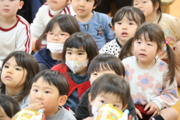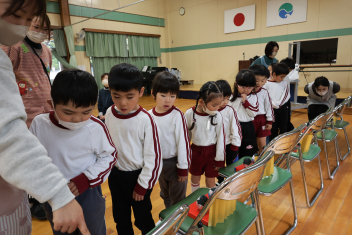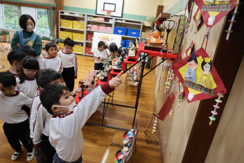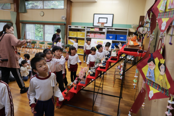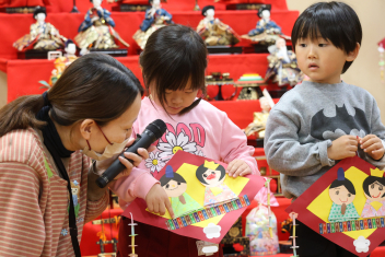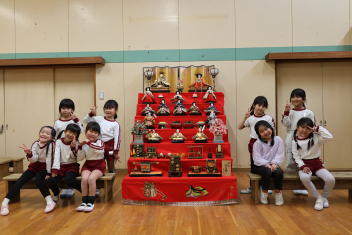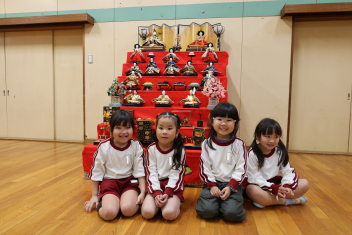 • 今日は桃の節句、赤佐幼稚園では遊戯室に全員のひな人形を飾ってひなまつり会を開きました。