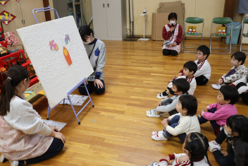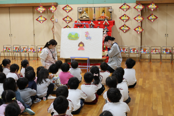 次に、先生方がひな祭りの由来をパネルシアターで紹介しました。子供たちは真剣に聞いていました。