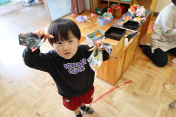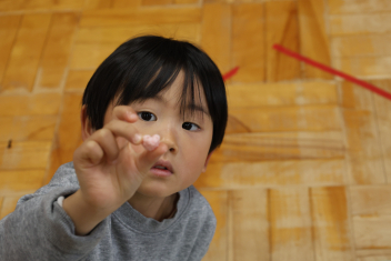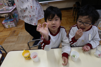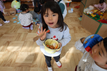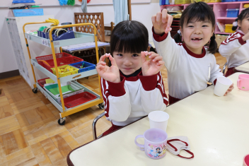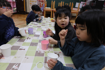 保育室に戻ったらお楽しみがありました。ひなあられと甘酒に見立てたカルピスです。ひなあられはハートの形をしていたので、とても気に入ったようです。