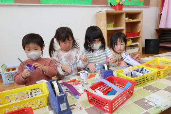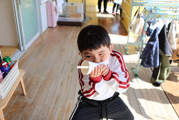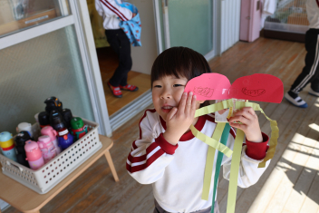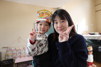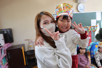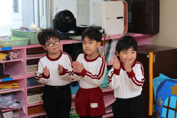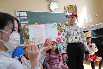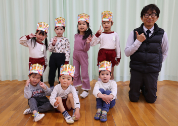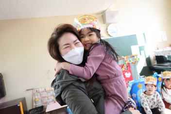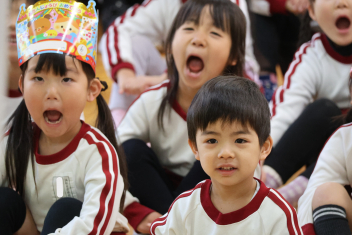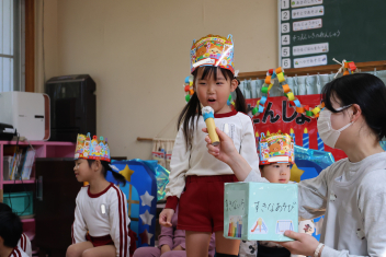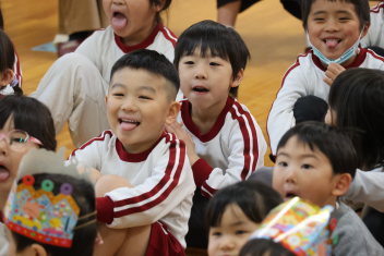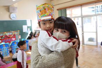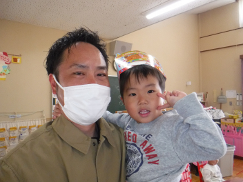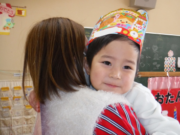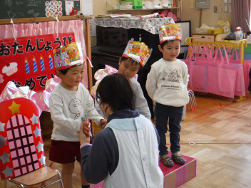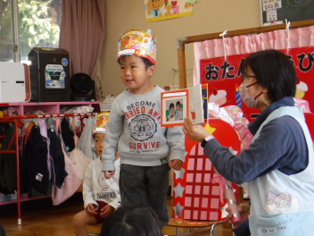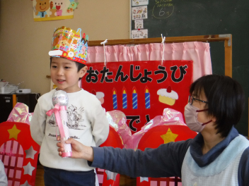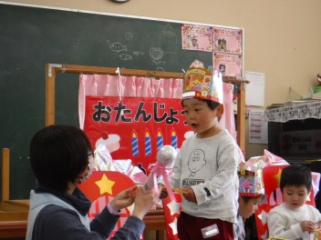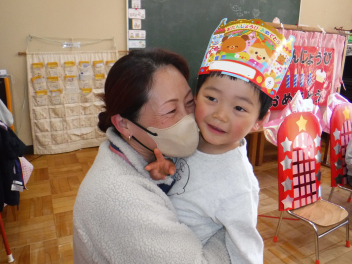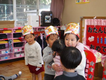 • 今日は、今年度最後の3月・4月生まれの子の誕生会でした。年少さ3人、年長さん4人と一番多い人数でした。それぞれのお部屋で、おうちの人にも来てもらってお友達とお祝いをしました。誕生月の子は、冠をかぶって、ニコニコ顔でとってもうれしそうでした。好きなことや食べ物を聞かれて、自慢げに答えていました。最後は、ママやパパにギュッとハグしてもらいました。