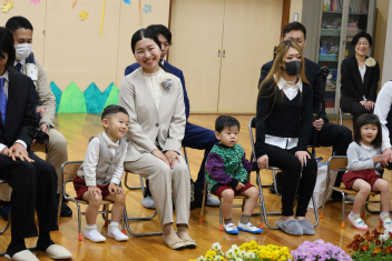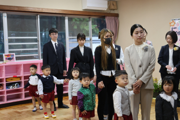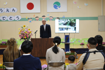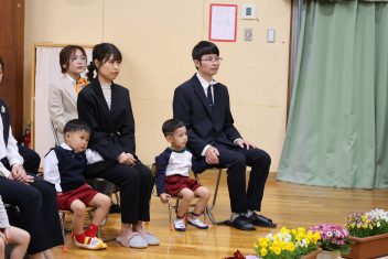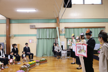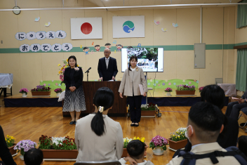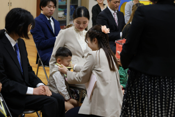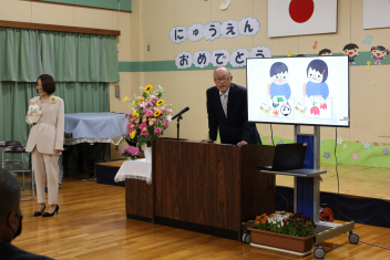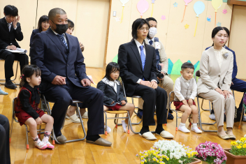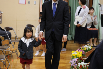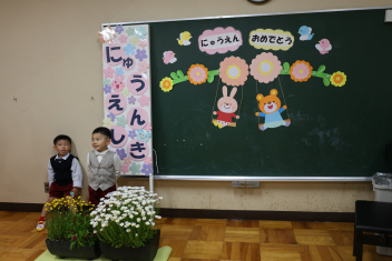 式の中では、席を離れる子が一人もなく、少しはにかんだ感じもありましたが、お話を聞けていました。園長挨拶や「お楽しみ」で、「幼稚園って楽しいな」と感じてもらえるよう、園長も職員も頑張りました。