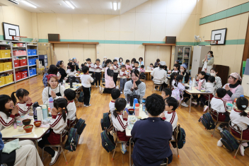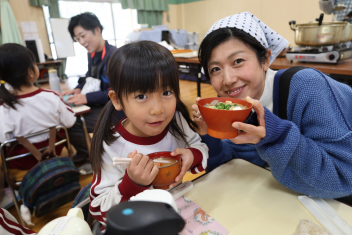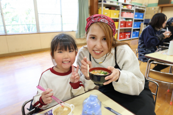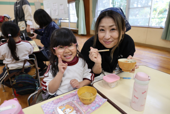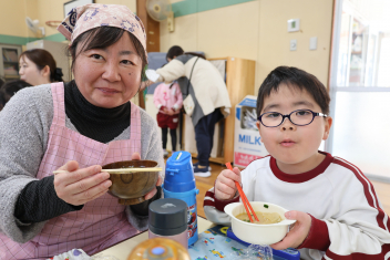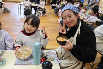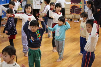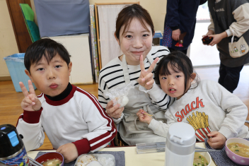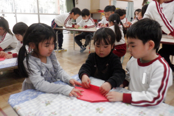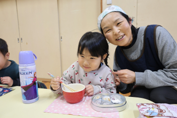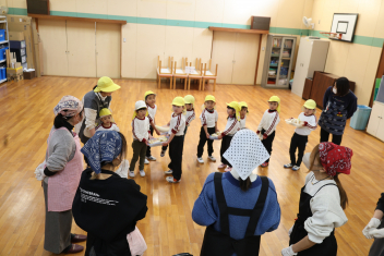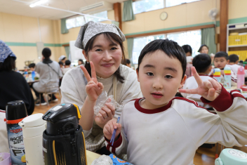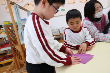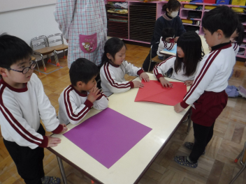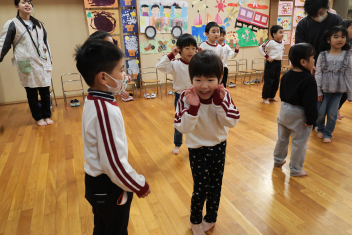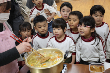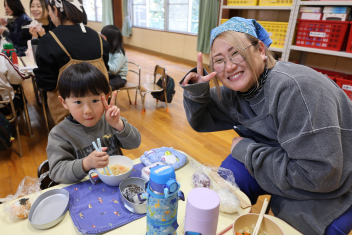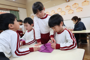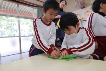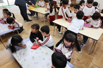 本年度2回目の年長さんの食育教室を講師に栩木さんを招いて行いました。まずは前回のおさらいで、三大栄養素(赤・黄・緑)の食材について確かめました。ごはんや野菜は簡単に分けることができていましたが、「ひじき」は悩んでいました。続いて、小学校生活に向け、小学校で実際に使用している食器等を浜北給食センターから借りてきて、配膳の仕方を体験しました。最後に、持参弁当の中の三大栄養素を確かめながら美味しくいただきました。