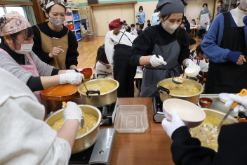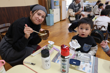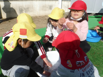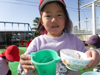 バットには輪切りにしたサツマイモ、食管はスープ代わりの水が入っていて、トングやおたまでよそう練習をしました。