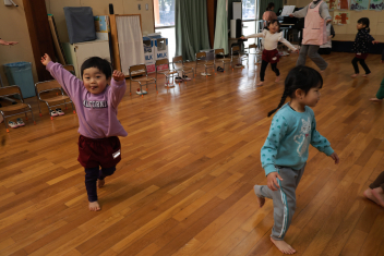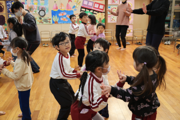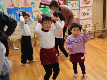年中さんと年少さんは、お部屋でピクニックランチをしました。