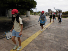 昼食後は、最後の目的地である「アクト通り」に向かいました。地域のボランティアさんの案内で通りにある様々な「ユニバーサルデザイン」に触れ、「誰もが安心できる」「その人に合った使い方ができる」といったUDの本質を、目で、耳で体験して深く学ぶ時間を過ごしました。今後、総合的な学習の時間を中心にまとめていきたいと思います。