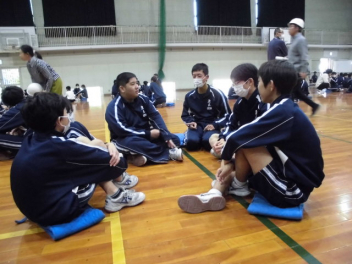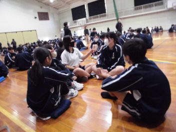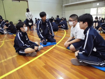 また、昨日行われた防災オリンピック(1年生対象)での学習を基に、1年生が体育館の危険な場所と安全な場所を構造から発表してくれました。さらに、避難する上では、他にどんな危険が考えられるか縦割りのグループで話し合いました。
