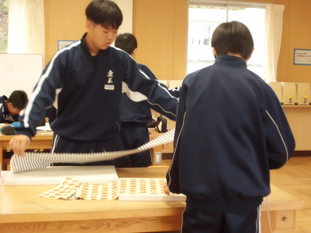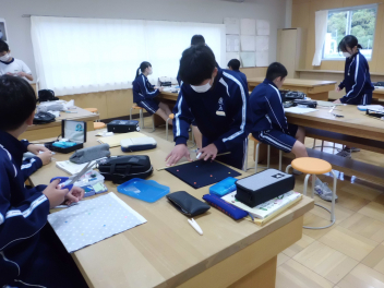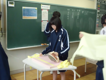 5組では、作業の時間に体育祭で使ったハチマキのアイロンがけをしていました。