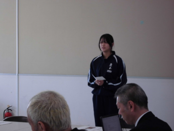 会長あいさつの後、2年生2名から職場体験、1年生1名から防災オリンピックの報告。