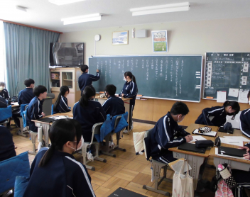 麁玉中学校では、昨年度から、1年生の12月の国語の授業で「五色百人一首(100枚を20首ずつ色分けして覚えるものです)」に取り組んでいます。