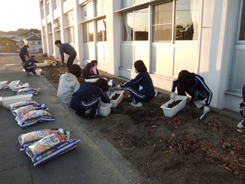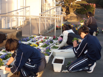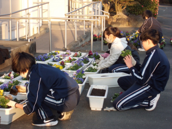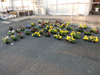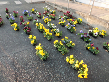 美術部の生徒の皆さんと奉仕委員会の職員が、卒業式、そして入学式に向けて、プランターにパンジーを植え替えてくれました。