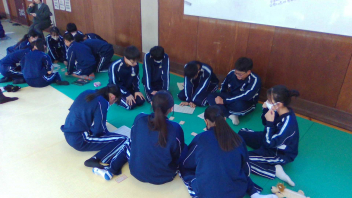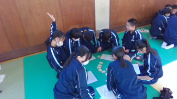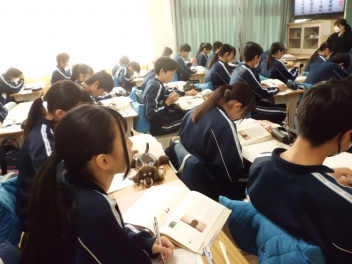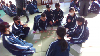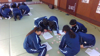 麁玉中学校では、昨年度から、1年生の12月の国語の授業で「五色百人一首(100枚を20首ずつ色分けして覚えるものです)」に取り組んでいます。