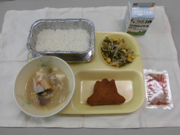 •  今日は、「ふるさと給食の日」でした。また、静岡県の子供たちに静岡県でとれる食べ物のよさを知ってもらうための「ふじっぴー給食」、そして「浜松パワーフード給食」の日でもあります。静岡県産のくきわかめ、かつお節、白菜や浜松市産のチンゲンサイ、もやし、大根など、地元の食材を味わっていただきました。富士山コロッケの形がかわいいですね。