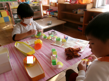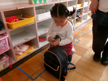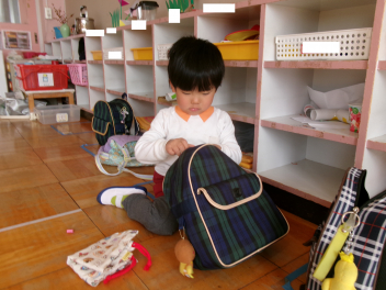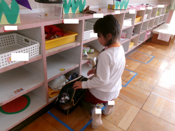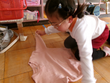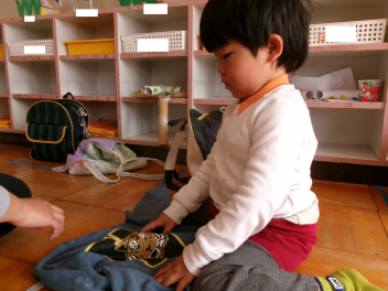 • 年少ちゅうりっぷ組さんは自分でお支度ができるようになってきました。洋服を畳んだり、水筒を準備したり、少しずつ自分のことを自分でできるようになってきましたね。