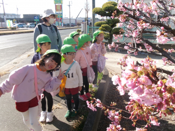 河津桜がとてもきれいに咲いていたので、記念写真を撮りました。(年少さん)