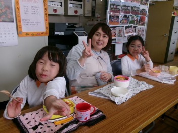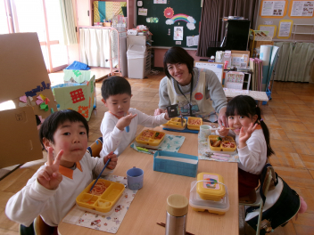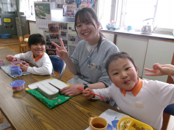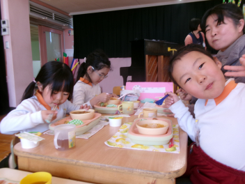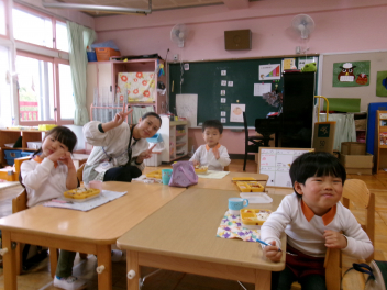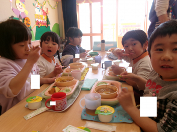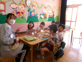 • 年長さんが職員室でお昼ご飯を食べました。みんなで食べる食事はおいしかったですね!laugh