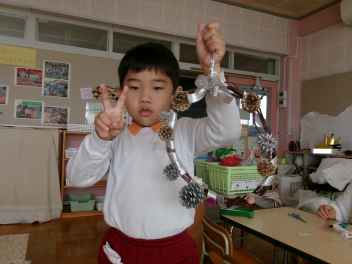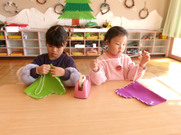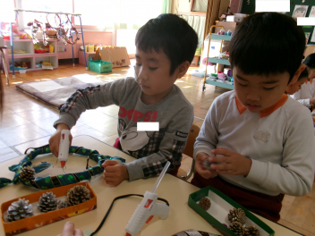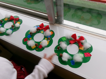 • クリスマス会に向けて、リースやブーツを作りましたlaughそれぞれのクラスで、可愛らしい飾りができたようですね。laugh