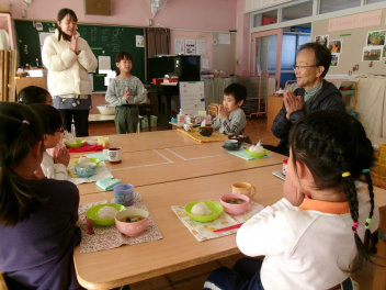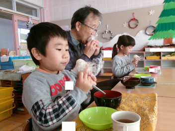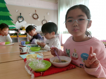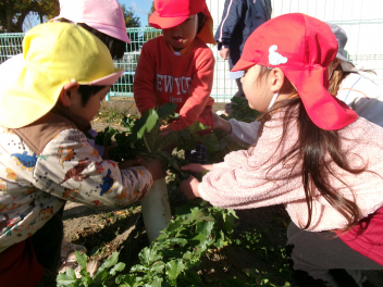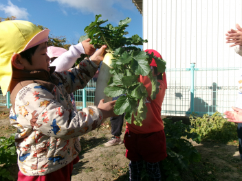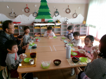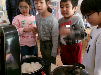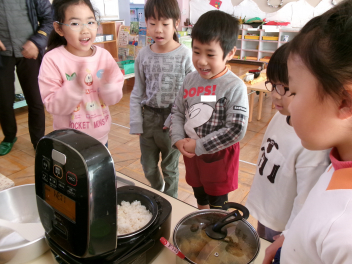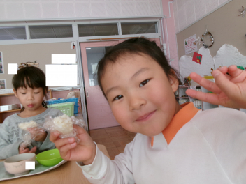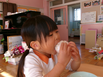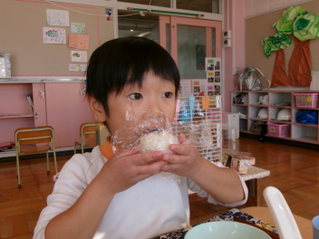 • お昼時になると有玉幼稚園のお部屋には、炊き立てのご飯のいいにおいが漂ってきました。laughみんなが楽しみにしていたおにぎりパーティ!年長さんが育てた稲が大きく成長したので、今日はそのお米をいただきました。自分たちで育てたお米の味は格別だったようです!また、畑で育てた大根とさつまいもを使った味噌汁もいただき、子供たちは大満足でした。感謝の気持ちをもっていただく子供たちの姿はとっても生き生きとしていましたlaugh
