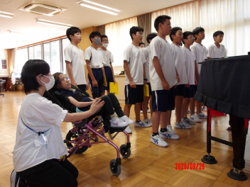 8年3組の音楽の授業に参加し、子供たちと交流したり、合唱練習に合わせてリズムをとったりしていました。