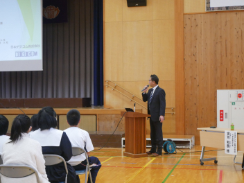 • 11月13日(木)、企業代表による特別授業が行われました。今年度は、日本デジコム株式会社 代表取締役社長の宮司和泰様をお招きし、中学生全員がお話を伺いました。近年私たちにとって急速に身近なものとなったAIを中心に、わかりやすく説明いただきました。AIもSNSも、とても便利なものではあるけれど、扱う自分たちがどう向き合い、適切に判断し、かかわっていくかが大切であることを子供たちは学んでいました。これからの未来を担う子供たちにとって、必要な価値ある学びを得られた特別授業でした。