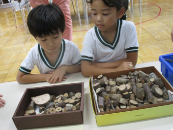 手で触ったり、匂いを嗅いだりして木の感触を楽しんでいました。