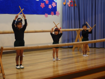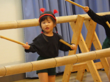 年長さんは、憧れの種目でもあり、カッコよくバチを動かします。