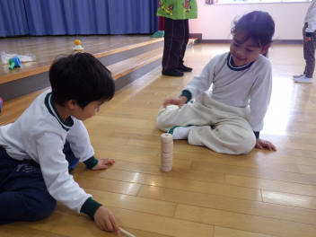 ‵だるまおとし’は、コツをつかんだようで、3つ目までは、‵スパーン’といい音を響かせて落としますfrown
